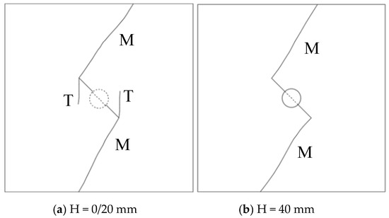 Types of crack propagation in hole-crack specimens with different hole depths under lateral stress σ2 = 4 MPa (M—compound crack; S—shear crack; T—wing crack).