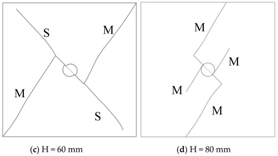 At the lateral pressure σ2 = 4 MPa, specimens with different hole depths exhibit different cracking patterns. When the hole depth is H = 0 mm and 20 mm, it is a specimen with single crack or shallow hole, and the cracking pattern is shown in Figure 31a. The specimen exhibits a wing crack pattern of vertical prefabricated cracks, which is determined to be a composite crack. However, the anti-wing cracks that appear in the later stage are tensile cracks perpendicular to axial stress, and the final fracture mode is tensile composite fracture. At the hole depth H = 60 mm, the expansion pattern of the specimen is similar to that of the specimen with a penetration hole at a lateral pressure of σ2 = 6 MPa, and its main propagation mode is compound-shear fracture, as shown in Figure 31c. At the specimen hole depth H = 80 mm, the hole is close to penetration, which can be regarded as the hole that divides the prefabricated crack into upper and lower parts, resulting in wing cracks above and below the hole, respectively, and the fracture mode is compound fracture, as shown in Figure 31d.