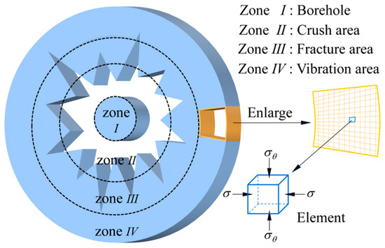 The crushing behavior of rock via blasting is a complex energy transfer process. The crushing effect depends on the mechanical property parameters of rock and is also affected by other factors such as the surrounding environment, in situ stress, and inertia effects. The effect of rock breakage after blasting can be summarized as follows: the reflection of the shock wave causes rock tensile damage, the expansion of explosion gas leads to compressive and shear failure, and both factors influence the formation of the final crack. This view is considered comprehensive, and the obtained results align with the actual situation, which most blasting workers recognize. Therefore, it is believed that the shock wave plays a vital role in the formation of initial radial cracks in the rock, and the formation of a large number of broken rock circles is the result of the blasting gas’s action [16]. The failure zone and stress state of rock blasting is shown in Figure 1, where is the radial compressive stress and is the tangential tensile stress.