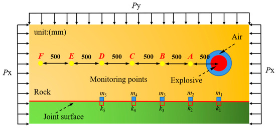 A computational model of single-hole blasting was developed using ANSYS 19.0/LS-DYNA numerical simulation software to analyze the influence of in situ stress on the rock-blasting effect and the crack distribution characteristics of the pressure field. Figure 2 shows the schematic view of the hard roof blasting and the measuring point position. A total of 6 monitoring points were set up from the borehole to the model boundary, and the interval of each monitoring point was 0.5 m. Five monitoring points were set up at the marker miki (i = 1–5) on the joint surface. The initiation conditions of the model are as follows: the diameter of the boreholes were 20 mm, 30 mm, 40 mm, and 60 mm, respectively, and the surrounding rock pressure of the x-axis and y-axis were 5 MPa and 15 MPa, respectively. A non-reflective boundary was set around the model, and displacement constraints were imposed in the thickness direction. The ALE algorithm was used to avoid calculation divergence and unreliable calculation results caused by excessive deformation of explosive and air units. The model size is 5000 mm × 5000 mm × 14 mm.