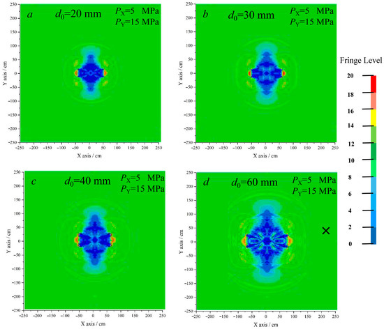 Figure 3 shows the shock wave stress nephograms under different diameters at t = 1 ms after the main explosive was detonated. The detonation energy first acts on the surrounding rock of the hole wall and then forms a high-intensity blasting dynamic load, rapidly diffusing from the hole wall to the deep surrounding rock. The detonation energy decays rapidly during the propagation. The numerical results indicated that the crack propagation is governed by the detonation energy in the vicinity of the borehole, and the confining pressure can affect far-field crack propagation. The cracks tend to propagate towards the region of high initial pressure [24]. Moreover, under the same in situ stress conditions, the stress wave propagation range linearly increases with the charge diameter.