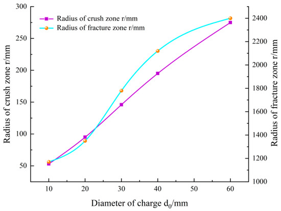 The radius range of the fracture zone and crushing area of each group of models were extracted and are shown in Figure 3. The relationship curve of the charge diameter is shown in Figure 4.