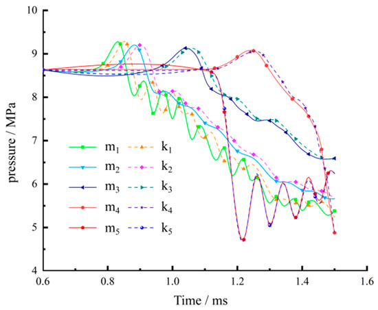 Reflection and transmission occur when stress waves encounter faults and joints during propagation. The energy consumption increases with the number of reflections. The more times the stress wave is reflected, the less efficient it is at breaking the rock. Six monitoring points were selected on both sides of the joint surface to analyze the pressure variation on both sides of the joint surface, as shown in Figure 5.