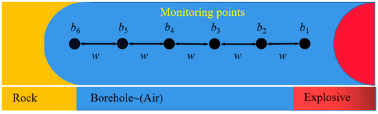 When an uncoupled charge is used, the energy generated after the explosive is detonated first acts on the air in the borehole and then contacts the rock through the air. The surrounding rock of the borehole reaches the yield failure instantaneously due to the shock wave, and the rock unit cannot directly reflect the detonation pressure. Therefore, selecting the air unit between the explosive and the rock can effectively analyze the pressure change acting on the rock after the explosive is detonated, as shown in Figure 6. A total of 6 monitoring points were set up from the cartridge to the borehole wall, and interval space w of each monitoring point was 5 mm.