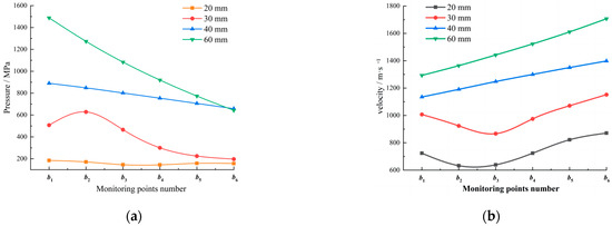 The monitoring point data of different charge diameters were extracted to create the pressure and velocity change curves shown in Figure 7. With the propagation distance increase, the shock pressure linearly decreases. However, under the influence of the air medium, the explosive is diffuse in the open space, reducing the density of the cartridge (the detonation wave velocity will be reduced (Figure 7b monitoring point b2)). Then, as the detonation wave propagates, the air density increases, and the velocity also increases in the gap between the cartridge and the borehole wall. On the whole, the impact velocity increases as the diameter of the cartridge increases, and the impact pressure and speed also increase. The maximum impact pressure of the 60 mm diameter cartridge can reach 1488 MPa, almost 8 times that of the 20 mm cartridge. The maximum impact speed can reach 2 times that of the 20 mm diameter cartridge.
