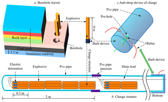 Three vertical boreholes were drilled on the roof of the intake airway of the 6302 working face for the blasting test. The borehole spacing was 10 m, and the depth was 51 m. The strata distribution and blasting parameters are shown in Figure 8. Aqueous-gel explosives permitted in secondary coal mines were used. The 5-segment millisecond-delay electric detonator permitted in coal mines was used to initiate the main charge, and the delay time was 100 ms.