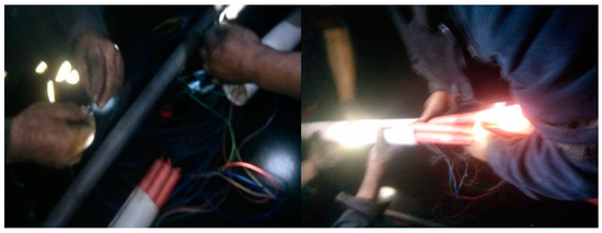 The charge length of a single borehole was 10 m, 36 kg of explosives were used, and 9 detonators were consumed. The rolls of water-gel explosives were placed in bundles in PVC pipes to form cartridges, and the cartridges were placed at the bottom of the borehole. Figure 9 shows the on-site workers connecting the cartridge.