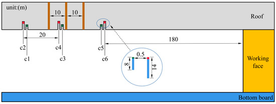 Each group of stress receivers was spaced 0.5 m apart, and the burial depths were 8 m and 14 m, respectively. The shallow hole was close to the blast hole side. The initial value of the stress measuring point installation was set to 5 MPa, and the alarm triggered when the stress in the deep hole exceeded 12 MPa or the stress in the shallow hole exceeded 10 MPa. Two sets of stress receivers, located at the deep hole and the shallow hole, were placed on the coal wall at an interval of 20 m, and 15 groups of sensors were installed on the coal wall. During the blasting test, the stress receivers corresponding to the position of the borehole were numbered c3 and c4. The receiver was 180 m away from the working surface, and the specific layout is shown in Figure 10.