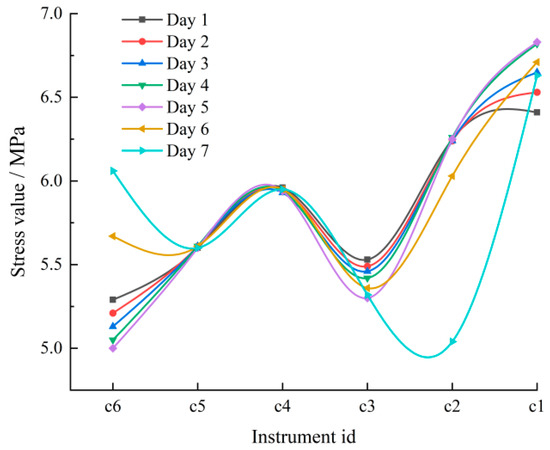 The stress receiver output a set of data every minute. Three groups of stress-monitoring values were extracted to analyze the changes in coal seam pressure caused by blasting, creating a stress curve with the mean value, as shown in Figure 11.