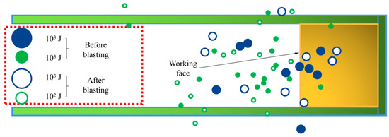 Figure 12 shows the microseismic events three days before and after blasting. According to the monitoring data, there were 25 microseismic energy events greater than 102 J before blasting and 14 microseismic energy events greater than 102 J after blasting. In the three days before and after blasting, 103 J-level events occurred 9 times, each near the working face. Combined with the location of the roof blasting, the larger events transferred to the working face, and the distribution was no longer concentrated, and the overall number of the larger energy events were lower than before blasting. The large-energy events were transferred to the tunnel face after the broken roof occurs, and the stress distribution was no longer concentrated. Overall, the rock formation in front of the working face was broken after blasting, which can release elastic energy accumulation and reduce the probability of rock bursts.