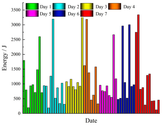 Figure 13 shows the change law of energy events three days before and after blasting. A range of 102~103 J-level energy events accounted for 56.25%, and 103~104 J-level energy events accounted for 43.75% of events, both of which did not reach the orange warning level. The operating range was within the safety threshold. From Figure 13, the rock layer did not break immediately after blasting and still had partial bearing capacity. After a period of time, large deformation and breakage occur and then tend to stabilize.