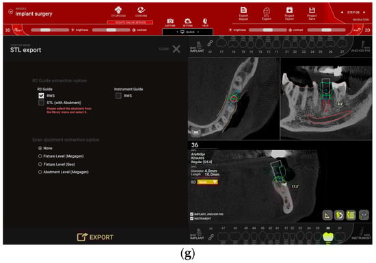 Surgical guide design in R2Gate™ software, version 2.0: (a) DICOM files from CBCT and .stl files of the patient’s corresponding dental arch impression are imported in the software, and a three-point matching is performed; (b) a second 3D manual matching of CBCT with the digital model is undertaken; (c) design of the digital wax-up; (d) for dental implant insertion in the mandible, one extra step, alveolar nerve tracing, is required; (e) selecting the adequate implant and 3D positioning panning according to the final prosthetic restoration and the existing width and height of the bone; (f) when planning is performed and approved, the R2Gate corresponding drill core is selected and the window is positioned on the buccal side; (g) the planned implant position is exported as .rws file.