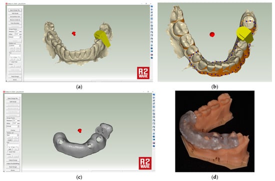 The planned implant insertion is exported as .rws file (RimWorld game save file) or as a .stl file (stereolithography—a popular 3D printing technology). R2Ware version 1.1.40201 software uses .rws files for the design of the surgical guide with incorporated sleeves, and the main steps are: (1) remove undercuts; (2) draw boundaries; (3) cut boundaries; (4) set parameters (thickness of the guide and offset—the space between the inner surface of the guide and the surface of the model); (5) window set (for inspecting windows used to ensure that surgical guides fit well on neighboring teeth); and (6) text (for writing the patient’s name on the external surface of the guide) (Figure 2a,b). The designed guide (Figure 2c) is usually manufactured with the aid of a 3D printer (additive manufacturing) or, less often, by milling in an acrylic blank (subtractive manufacturing). Due to its ability to reproduce complex structures at reduced cost and reduce material waste, additive manufacturing is the most popular method [21,22]. The full resin surgical guide is printed using E-Guide Resin (EnvisionTEC GmbH, Gladbeck, Germany) with the Digital Light Processing (DLP) technique, and its fit is checked on the patient’s model (Figure 2d) before using it for implant surgery.