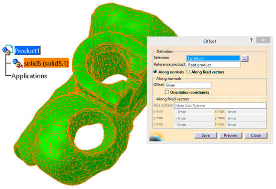 From the DMU Optimizer workbench, the Offset tool is used, which creates a new surface superimposed on the initial surface (offset value = 0 mm), according to Figure 3. This newly obtained surface is saved as a .model file, and it is easily recognized by the program in the following steps.