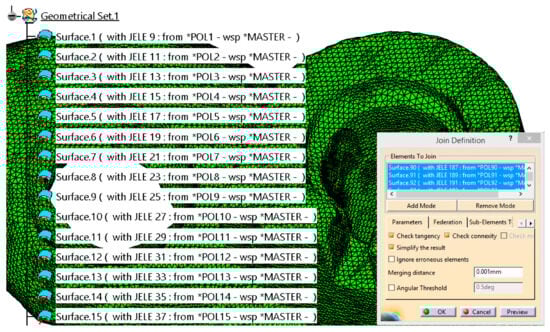 In the second step, with the help of the Part Design workbench, the user opens the .model file. It contains a series of small patch surfaces formed by several triangular elements of the initial surface. This is, therefore, a first simplification and union of the individual elements of the mesh surface (Figure 4). All these Surface.x components, as represented in the specification tree in Figure 4, are joined into a single surface with the help of the Join tool. Its dialog box contains several options for checking and simplifying the final surface. Thus, the program checks for tangency and connexity issues while trying to simplify the resulting surface.