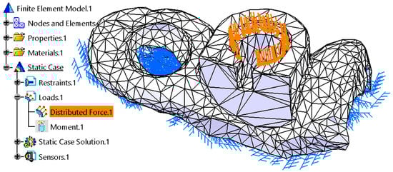 The main load of the guide is given by the axial cutting force Ffw = 11.62 N, arranged on the surface of the guide (Figure 5) to limit the movement of the drill in the process of drilling into the mandible bone. Additionally, on the inner cylindrical surface of the main hole of the guide is applied a cutting torque equal to 10% of MW. The value of 10% is average and recommended. This value depends a lot on the quality of the surfaces of the drill and the guide, but also on the way the surgeon manipulates the drill so that its axis coincides, as much as possible, with the axis of the guide hole. The establishment of this value is based not only on research and recommendations found in the literature [31,32], but also on many observations and practical determinations.