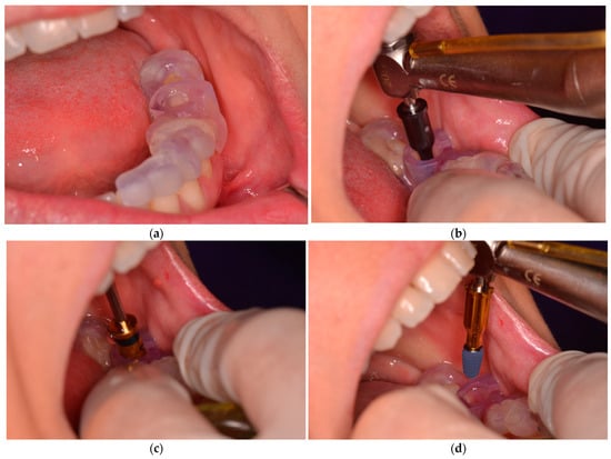 Representative digital images suggestive of flapless implant bed preparation and insertion with the aid of the surgical guide, without metallic sleeves: (a) the guide is placed over the remaining natural teeth (tooth-supported guide type); (b) an initial drill is needed to initial the path in the cortical bone; (c) the implant osteotomy has to be prepared using the guide stop drills in a successive order based on drill diameter and length; (d) guided dental implant insertion.