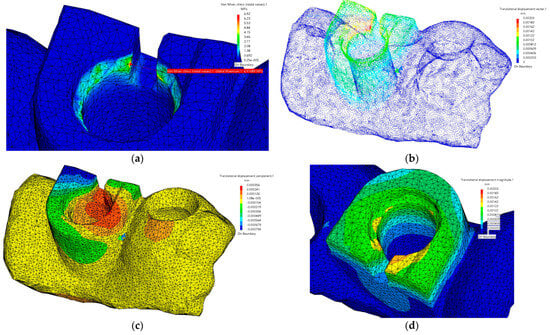 The area of maximum stress is red (Figure 7a), then, as the stress decreases, the areas are orange, yellow, green, up to dark blue, which are the least stressed. Figure 7b shows the displacements of the guide as red, orange, and yellow areas, but their maximum value is 0.002 mm. This does not influence the movement of the guide fixed on the teeth or the diameter of the guide main hole, which would thus produce additional contact with the drill shank. Figure 7c,d show how displacements propagate. Thus, a more pronounced propagation (orange color) is observed on the thinner wall of the guide with a flat surface (light blue color in Figure 7d). Additionally, in Figure 7c, it is noted that the guide has a small tendency to move from the neighboring tooth (right), but the value is very small and insignificant.