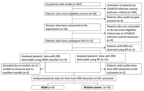 Among the hospitalized stroke survivors, 18 met the eligibility criteria. Among them, 16 provided informed consent to participate in this study. The case of one patient, who was discharged from the hospital after the experiment, was postponed because of the COVID-19 outbreak, and two patients who recovered from paralysis and whose FMA-UE scores exceeded the eligibility criteria of 20 points were excluded, leaving 13 patients for the experimental analysis. In the experiment in which ERDs were detected by the MSM and RP algorithms, the data regarding the 13 patients were detected by MSM, and one patient, whose data could not be detected by RP, was excluded from the analysis. In the measurements of the reaction time using the DiC activated by the ERD data detected by the MSM, one patient, who was an outlier, and three patients whose reaction times could not be measured owing to machine trouble were excluded. Finally, nine patients were included in the analysis. Using the ERD data detected by RP, two outliers were excluded, and 10 patients were analyzed (Figure 5).