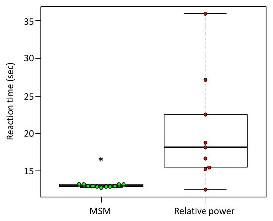 Comparison of the reaction time from ERD detection to DiC activation for the MSM and RP. The vertical axis indicates reaction time; MSM, n = 12; RP, n = 10; * W = 12, p < 0.0017, by Wilcoxon’s signed rank sum test.