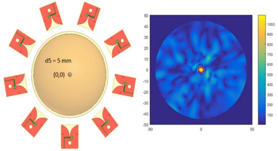 Radar-based microwave imaging (RMI) systems provide the fastest imaging inversion times. To reconstruct the image, several antennas are distributed around the breast phantom (please see the left panel of Figure 1). A low-power microwave signal is transmitted from each antenna, and the system registers and processes all the picked-up reflections [68]. The next step is to acquire the electromagnetic signals reflected from the breast for all combinations of antennas [70]. The process is repeated for different antenna heights. The medical doctor can view the reconstructed image after the signal acquisition (see the right panel of Figure 1). The algorithm computes the image for the whole volume, which can then be sliced into cuts for precise examination. Several authors considered microwave imaging for the detection of breast cancer. In [64], the authors used nine Vivaldi antennas around the breast phantom to observe the tumor. In that case, one antenna was considered an electromagnetic wave transmitter, the remaining antennas were deemed scattered electromagnetic wave receivers, and the same process was considered for other antennas. The Microwave Radar-based Imaging Toolbox (MERIT) has been used to reconstruct an image from backscattered signals [75]. The results from this simulation suggested that this antenna array can detect a spherical tumor with a 5 mm diameter.