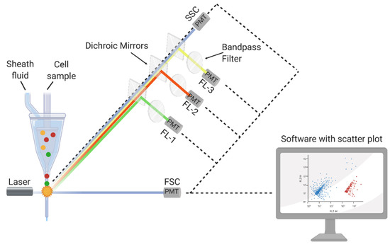 In the flow cytometry method, the physical scattering process is considered to determine the size, shape, and properties of a single cell in a combination of different cells [118,119,120]. Initially, the sample is mixed with saline solution in the cytometer and allowed to pass through a narrowing channel which finally causes a single cell to live in a single droplet. When this droplet with a single cell passes through the laser pulse, the droplet/cell interacts with the laser pulse [118]. The point at which the cell interacts with the laser pulse is known as the “interrogation point”. After the laser pulse interacts with the droplet/cell, it scatters in different directions. The portion of the laser that moves forward in focus after scattering is known as forward scatter (FSC) [118,119,120], and the portion of the laser that moves in the sideways direction after scattering is known as side scatter (SSC) [118]. Experimental setup of flow cytometry can be seen in Figure 4.
