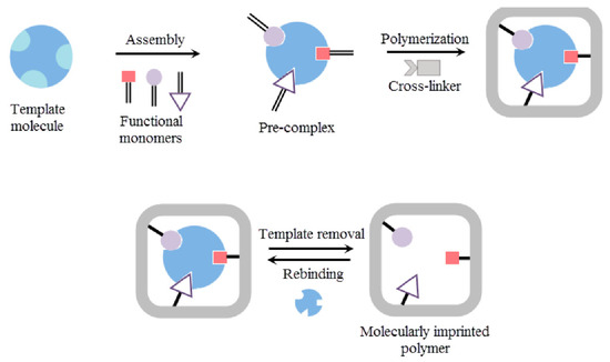 A molecularly imprinted polymer (MIP) is a polymer that has been designed by applying the molecular imprinting technique, and MPI can generate cavities in the matrix of the polymer to attract a particular template molecule [130]. Manufacturing a nano-MIP involves controlled polymerization around a targeted choice, immobilized on solid-face support [131]. This is then packed as a column. The nano-MIP is made by first exposing the target to monomers that find their optimal binding positions on the target through self-assembly. Different solvents and cross-linking agents have been used to complete this step. In the pre-polymerization step, the distribution of the functional monomers around the template is precisely organized by the chemical properties and shape (see Figure 5).