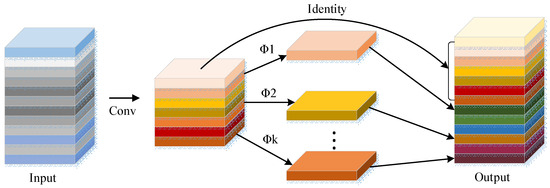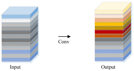 With the development of the times, mobile devices have become the main tool used by people. However, large-scale deep learning network models have many parameters and high computing requirements, making it difficult to transplant to mobile terminals. The emergence of lightweight network models solves this problem very well. Compared with large-scale deep network models, lightweight network models have very few parameters and calculations, and the model performance is not inferior to large-scale deep network models and can adapt to scenarios with limited hardware resources, such as mobile terminals and embedded devices. Currently, two types of lightweight networks are commonly used for model compression and compact model design. Knowledge distillation, network pruning, quantization, low-rank decomposition, etc., are commonly used model compression methods. Compact model design is also a very efficient method. For example, MobileNet [24] uses depthwise separable convolution as the basic unit while maintaining the effect, and the calculation amount and parameter number of the model are greatly reduced. ShuffleNet [25] adopts group shuffling, connects different groups, and fully learns features to ensure complete information. When the network is trained, the output feature maps (as shown in Figure 3) of ordinary convolutions (as shown in Figure 4) usually contain a lot of redundancy, some of which may be similar to each other. The main innovation of the GhostNet [26] network is the introduction of the Ghost module (as shown in Figure 5), which reduces the number of convolution kernels and calculations by using cheap linear transformations to generate redundant feature maps. The Ghost module uses initial convolution and cheap convolution instead of standard convolution. When the network is trained, the input data are X ∈ R(C × H × W) (C, H, W are the number of channels, height, and width), X first passes through the convolution kernel to be 1 × 1 initial convolution: