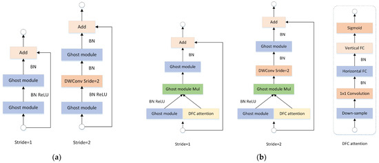 Figure 7a,b show the bottleneck structure of GhostNet and GhostNetV2, respectively. On the basis of GhostNet, GhostNetV2 introduces the DFC attention mechanism on the parallel branch of the first Ghost module to enhance the expansion ability of features.