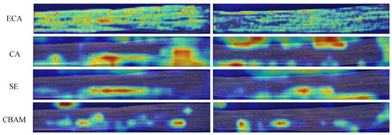 In addition, we drew the heat map of the model after the four attention modules using Grad-CAM [34]. Grad-CAM is a visualization method that generates a heat map showing which regions of the input picture are most relevant for the prediction of that category, based on the output category of the network. As shown in Figure 12, CA tended to focus on the edges of the picture, mistaking some backgrounds as part of the disease. SE paid less attention to the characteristics of the disease. CBAM lost most of the disease characteristics and also considered some backgrounds as diseases. ECA paid the highest attention to diseases and could detect almost all disease characteristics. After comparing the four sets of experiments, we replaced the attention mechanism SE in the source model with ECA.