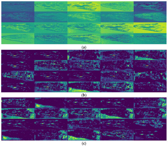 Figure 13 shows some visualizations of the output feature maps of the improved model and the original model block module. It can be seen from the figure that the improved model extracts brighter image feature information in Block1, such as texture, edge, color, etc. The visual information of the feature map in the deeper Block2 is reduced and the abstract information is increased. In Figure 13b,c, the feature extraction of Block2 in the improved model is very similar to the feature extraction of block in the original model, which proves that our replacement of the model’s shallow CS-Bneck with FusedBMcon does not affect the model’s learning of disease characteristics.