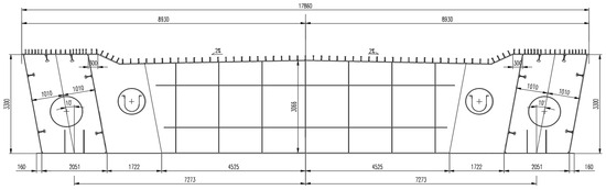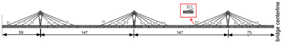 Bridge elevation layout (only one-quarter of the bridge structure shown due to symmetry, dimensions in m).