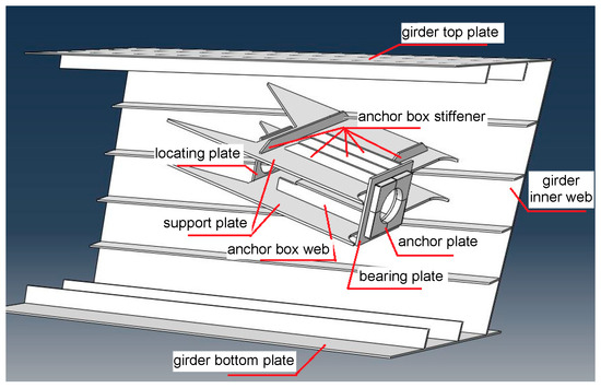 The cable-girder anchorage structure of a steel cable-stayed bridge is prone to fatigue damage under long-term cyclic loading because the area is subject to a large, fluctuating cable force, and the complicated structural details are composed of numerous plates and weldments [1,2]. In the engineering practice of large-span bridges, the fatigue performance of such anchorage structures is preferably and usually verified through an experimental investigation of a few large-scale specimens [3,4]. A corrosive environment, low temperature, and other factors may affect fatigue performance during service.