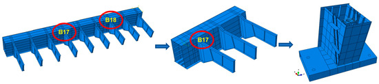 The fatigue test specimen was designed to represent the stress state of the original bridge at vulnerable fatigue details. The effect of the cable force was simulated by pressure added to the anchor plate. For the application of vertical fatigue loading, the test specimen was required to rotate at a certain angle. Due to the limitations of floor space and the loading capacity of the fatigue test machine, a 1:1 scale prototype was impossible. The choice of specimen scale should consider the available floor space (2 m × 2 m in plane and 3 m in height) and loading capacity (a maximum capacity of 500 kN and a suggested range of 50~400 kN). The specimen must provide sufficient space for the movement of the loading actuator with a diameter of 0.4 m. The actual supply of plate thickness and instrumentation limits should also be considered. Through a series of model comparisons, shown in Figure 4, the most stressed B17 anchor box was selected as the object of study, and a cable-girder anchorage zone specimen with a scale of 1:3.75 satisfying all laboratory restrictions was obtained. An auxiliary base was added to facilitate the installation of the test specimen, and an extra stiffener was welded to the inner web to improve local stress distribution.