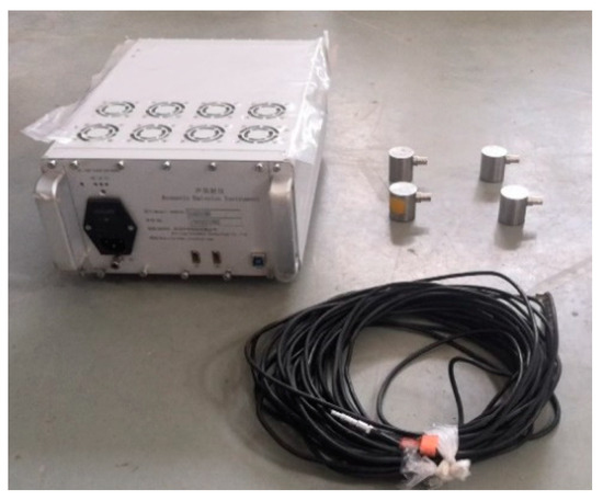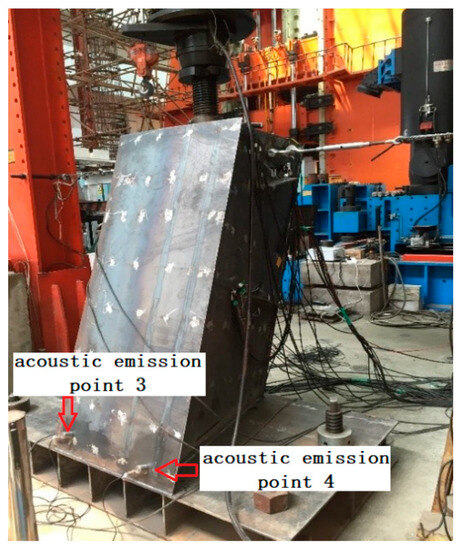 For observing possible fatigue cracking, conventional methods such as visual inspections and digital images were used for crack detection during the test. In addition, acoustic emission technology was employed in real time to monitor possible crack initiation and propagation during cyclic loading. A photo of the acoustic emission system is presented in Figure 7. Four acoustic emission sensors were installed on the surfaces of the test specimen, with monitoring points 3 and 4 mounted on the bottom plate of the box girder, as shown in Figure 5, and monitoring points 1 and 2 inside the box girder, as shown in Figure 6. Each sensor is capable of monitoring an area within a radius of 30 cm near the measurement point.