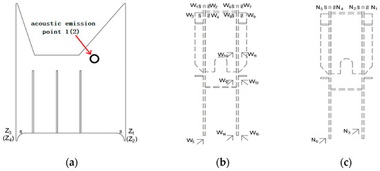 Schematic diagram of strain gauge position: (a) Support plates; (b) Girder outer web; (c) Girder inner web.