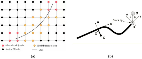 As illustrated in Figure 8a, the first part in square brackets of Equation (1) applies to all standard nodes for the continuous part of the finite element model, the second part applies to nodes in elements divided by the crack, and the third part applies to nodes in elements intersected by the crack tip. When there is no crack, the equation is reduced to the displacement function of the standard finite element method.