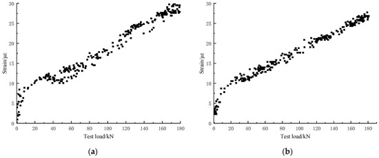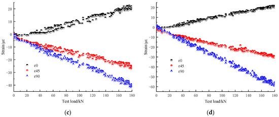 The load-strain curve at each strain measuring point was derived from the static load test. Representative curves for the strain gauge (W2 and W9) and strain rosette (W5 and W12) are shown in Figure 9, where W2 and W9, W12, and W5 reflect the strain status of the outer web at the top end, middle range, and bottom end of the anchor box-support plate weldment, respectively. For the strain rosette, ε0, ε45, 90 are the measured strains in the horizontal, oblique, and vertical directions. Figure 9 shows that the relationship between measured strains and test load is essentially linear, and data dispersion is within a reasonable range, demonstrating that the specimen was in a linear elastic stage during the test.