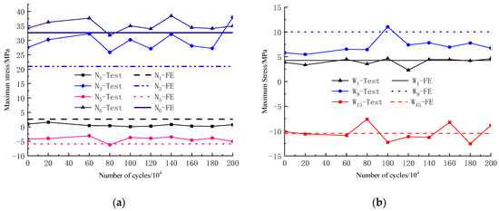 We can observe from Figure 10 that the maximum stress at various measuring points is maintained at a reasonably stable level as the number of loading cycles increases with fluctuations within 3 MPa. For most measuring points, the difference between the analytical results and the average of the experimental results is not significant. However, a higher discrepancy exists at point N3, mostly likely because of the more severe local stress concentration caused by the unexpected welding discontinuity of the nearby stiffener in the test specimen. In general, the experimental data agree well with the results from finite element analysis, indicating the reliability of the numerical simulation of stress distribution.