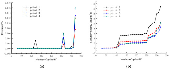 Two measures of energy data generated by acoustic emission technology were analyzed to reveal the fatigue cracking process. “Cumulative energy value” refers to the cumulative value of energy data monitored since the fatigue test started. Since a substantial increase in the proportion of observed high energy values indicates that a macroscopic crack is about to appear in the steel plate [27], the percentage of an energy value higher than 500 PJ per day was calculated for each monitoring point. The daily high energy proportion and cumulative energy at each monitoring point during the fatigue test versus the number of loading cycles are shown in Figure 11.