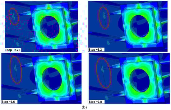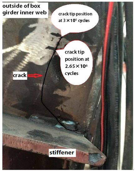 Numerical methods were employed to investigate possible crack initiation locations and crack propagation life in the cable-girder anchorage zone. Although the finite element model was validated against experimental investigation to prove its effectiveness concerning stresses, strains, and crack growth patterns, the fatigue life of the inclined crack initiated from the extra stiffener was not validated with experimental observation. Although the calculation of fatigue crack propagation life with the Paris equation is well established [2,11], comparing analytical results with two crack front positions observed at 2.6 million and 3 million loading cycles in Figure 12 would be interesting.