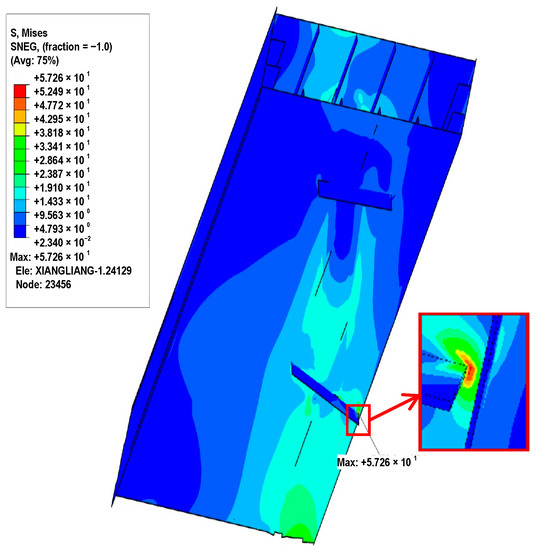 The finite element analysis results of the test specimen are shown in Figure 13. As shown, an apparent stress concentration exists at the end of the web stiffener where the crack occurred. A discontinuous stiffener weldment in the test specimen may have led to a deterioration in the stress state, which eventually caused a premature cracking in the vicinity of the extra stiffener. The position of the maximum tensile stress point from analysis coincides with the location of the crack observed, demonstrating the effectiveness of the finite element model adopted.