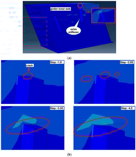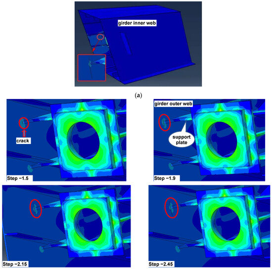 - An extended finite element method was adopted to analyze the crack initiation location and crack propagation path of the anchorage structure. A fatigue crack is most likely to appear in the outer girder web at the anchor end of its connection with the upper support plate. As illustrated in Figure 15, it probably will propagate to both sides along the direction that is perpendicular to the support plate and be arrested by the web stiffeners.