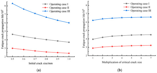 Conversely, a sensitivity analysis of ac in Figure 17b shows that, even if the critical crack size is increased by 1.43 m to seven times the original value, the crack propagation life under three operating cases increases by only 5.30 × 105, 3.46 × 105, and 3.97 × 105 cycles, respectively. Therefore, for assessing fatigue crack growth life, critical crack size or fracture toughness has little effect.
