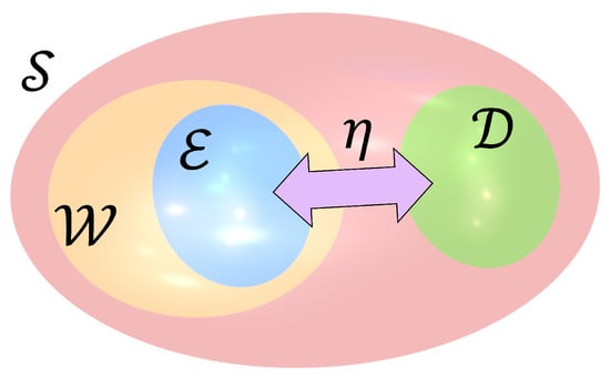 As an example, let us consider the Base41 encoding proposal []: there, three symbols from an alphabet of 41 characters are used to represent two octet strings, 256 one octet strings, and 255 bit strings of length from 0 to 7 bits. We may thus see a generalization of the concepts shown in Figure 1. In this embodiment is composed of the sequences of symbols of Base41; consists of the previously listed binary strings represented by Base41. The subset of is composed by strings, each one associated to a binary string with a function specified in []. The remaining Base41 sequences constitute the set (Figure 2).
