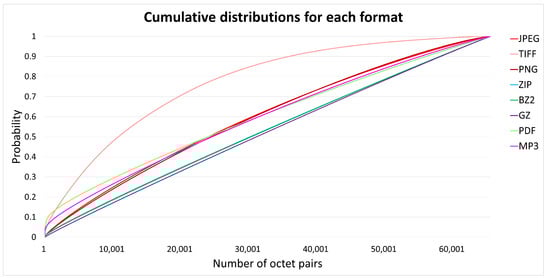 Cumulative distributions of all octet pairs sorted in decreasing order of frequency.