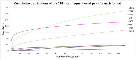 Cumulative distributions of the most frequent 128 octet pairs (zoom on the leftmost area of graph in Figure 3) sorted in decreasing order of frequency.