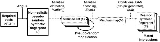 If the focus is the evaluation of biometric systems, the synthesis of mated impressions is the most important ability of a generative model. For that, the standard unconditional GAN architecture should be extended by two mechanisms: conditional generation (taking fingerprint identity as a condition) and the simulation of intra-class variations. The majority of fingerprint verification algorithms use minutiae as the means of fingerprint matching. Hence, the finger’s identity is de facto given by co-allocation of minutiae points. Hence, the straightforward idea to generate a fingerprint for a particular finger is to reconstruct it from minutiae. In our previous paper [7], we have demonstrated that the pix2pix architecture is a powerful and scalable conditional GAN (cGAN) that fits well for reconstructing fingerprint images from minutiae. Reconstruction from minutiae is also a key for fulfilling the requirements on the anonymity and diversity (as these are introduced in [8]) of synthetic fingerprints because the minutiae sets can be created in a pseudo-random way or simply derived from synthetic fingerprints that are known to be anonymous.
