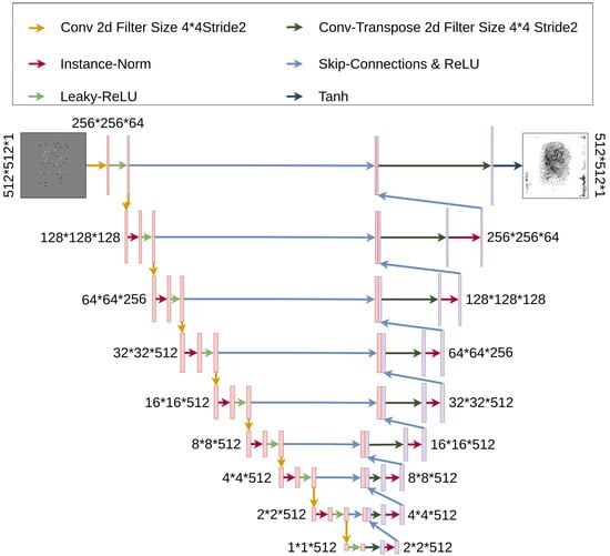 Pix2pix is a conditional GAN architecture proposed for image-to-image translation. Examples are converting satellite views to street views, summer landscape to winter landscape, or daylight pictures to night pictures. In our considerations, the generator G of pix2pix converts the minutia map M derived from a minutiae list L as described in Section 3.1.2 to a synthetic fingerprint image , see Equation (1).