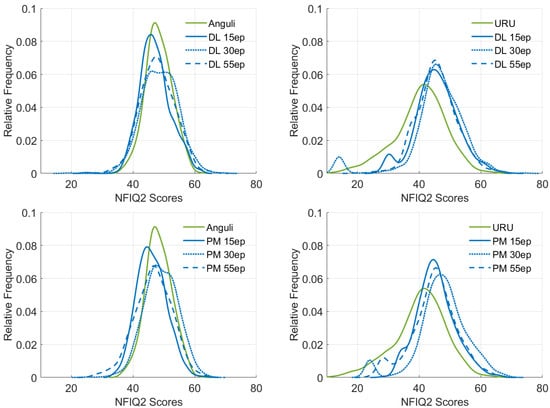 The general impression of our synthetic fingerprints can be taken from Section 4.1.3 and Figure 8. Here, we compare the distributions of the NFIQ2 scores for the compiled datasets. Figure 9 depicts the probability density functions of 40,000 samples included in each of the AMSL SynFP P2P v1 and AMSL SynFP P2P v2 datasets. We also plot the distribution of the original 4000 Anguli fingerprints as a reference.